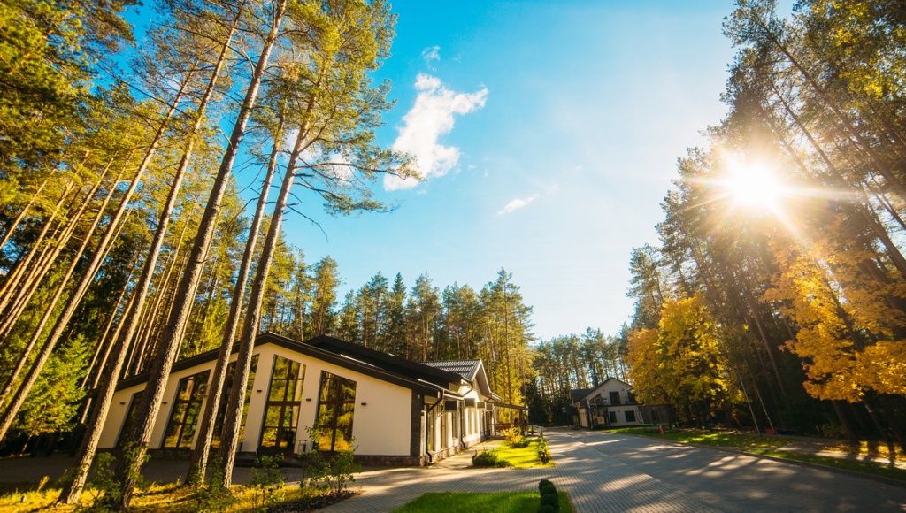 Комплекс состоит из 3 гостиничных корпусов и 4 двухэтажных гостевых домиков. Всего арендовать комплекс под Минском смогут до 92 человек.