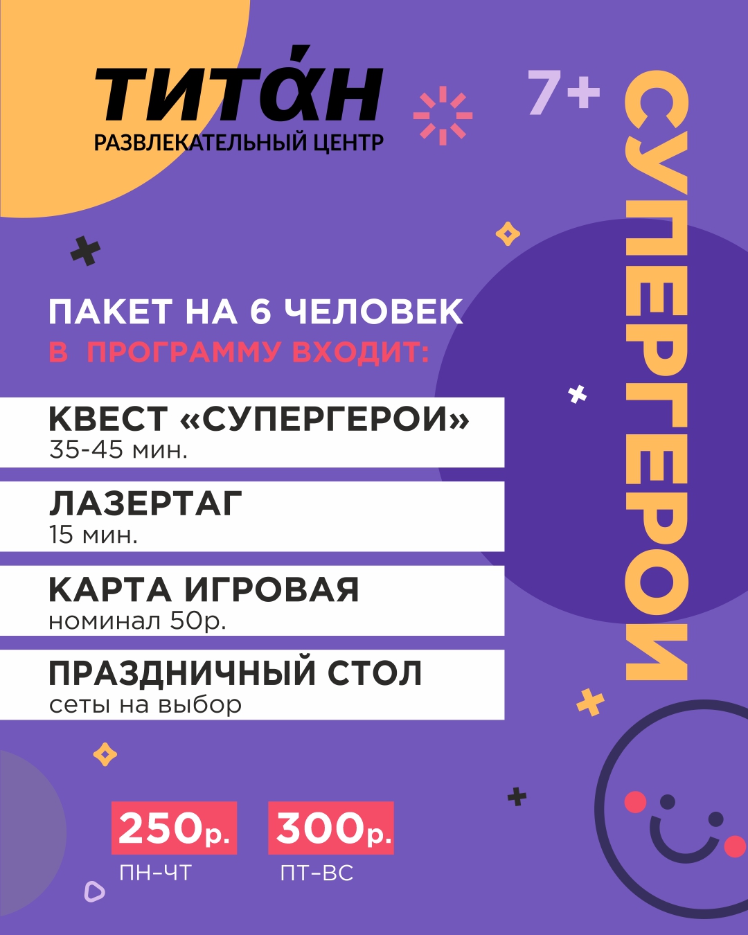 Мы разработали 5 пакетов для празднования дня рождения: «Киндер-пати», «Улетный», «Драйвовый», «Супергерои», «Мегамикс»