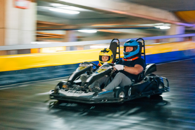 современная система телеметрии, современные гоночные машины. К гонкам допускаются дети от 7 лет и ростом от 135 см. Для ребят от 5 лет есть возможность прокатиться на двухместном карте и только в сопровождении инструктора или одного из родителей.