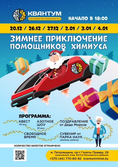 Новый год приближается и парк наук «Квантум» приготовил для юных гостей захватывающую программу «Зимнее приключение помощников Химиуса»!