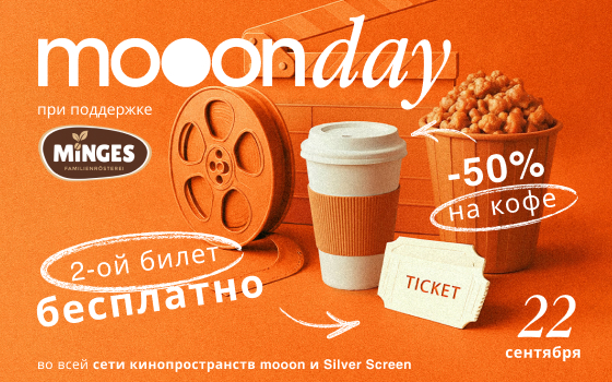 Только 22 сентября во всех кинопространствах mooon и Silver Screen проходит акция mooonday при поддержке бренда кофе Minges.