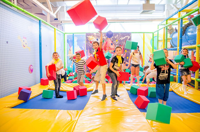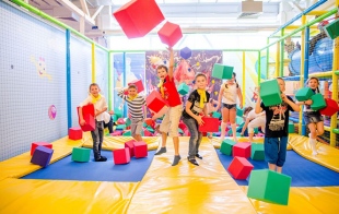 Развлекательный детский центр с батутной ареной и поролоновой ямой со скалодромом, лабиринтом "Мармелад", сухими бассейнами с горками и надувным батутом "Домик" в кидсзоне.